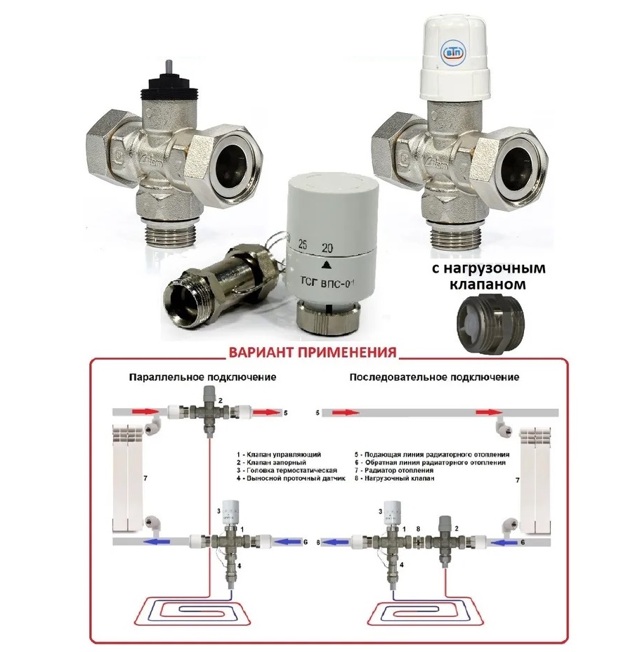 Основное назначение – подключение контура «Тёплого пола» к системе радиаторного отопления с принудительной циркуляцией. Циркуляция теплоносителя через контур «тёплого пола» обеспечивается за счет перепада давления, создаваемого насосом в радиаторной системе отопления. Установка обособленного циркуляционного насоса для контура «тёплого пола» в данном случае не требуется.  Отводные удобны и для подключения других отопительных или охладительных приборов и оборудования, подключаемых параллельно основной магистрали. Отводные клапаны компактны и сопрягаемы с разными типами труб.