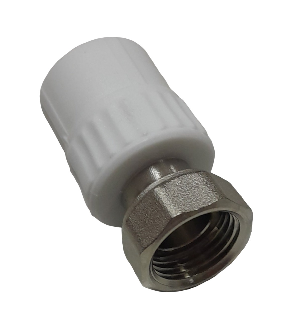 Муфта комбинированная из полипропилена с накидной гайкой из латуни с одной стороны имеет надвижное соединение для трубы, а с другой стороны фитинга находится внутреннее резьбовое соединение с накидной гайкой с плоским соединением. Накидная гайка позволяет быстро зафиксировать и смонтировать/демонтировать трубопровод и регулирующие элементы водопроводной или отопительной сетей без осевого вращения трубы, что в большинстве случаев крайне необходимо. Соединение с трубой осуществляется методом термофузионной раструбной сварки.