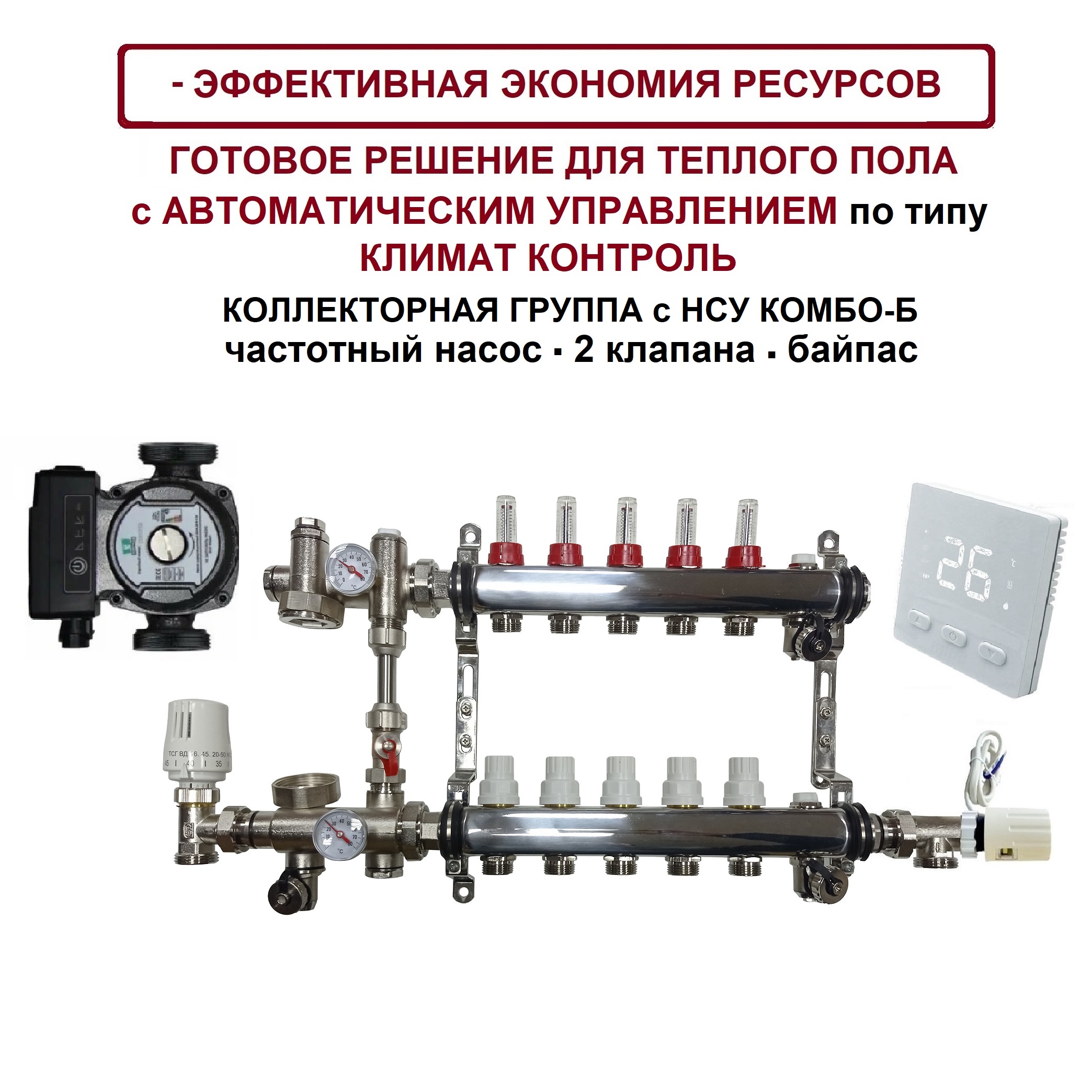 KOMFORT 5 контуров, комплект коллекторов теплого пола с НСУ КОМБО-Б с частотным насосом PU
