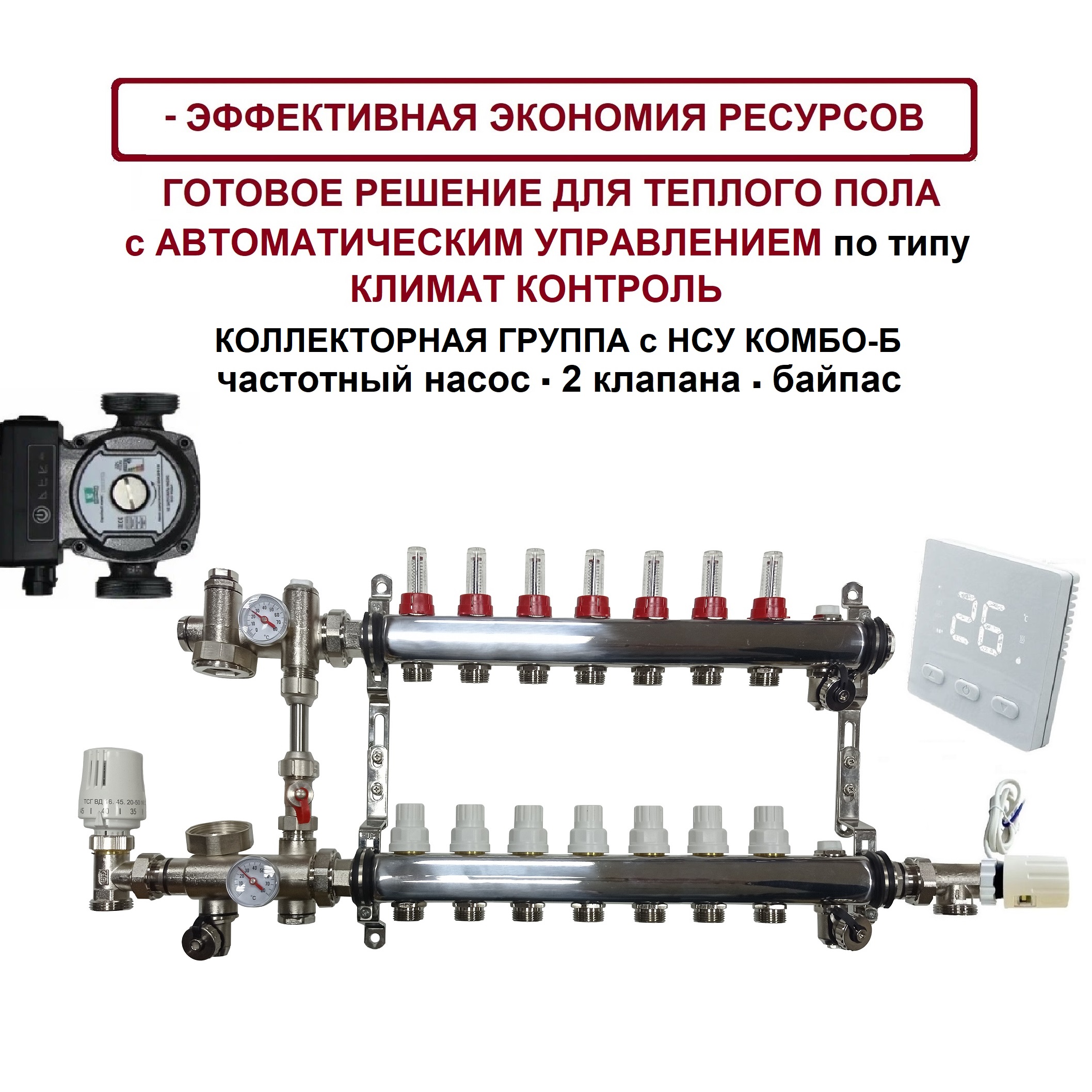 KOMFORT 7 контуров, комплект коллекторов теплого пола с НСУ КОМБО-Б с частотным насосом PU