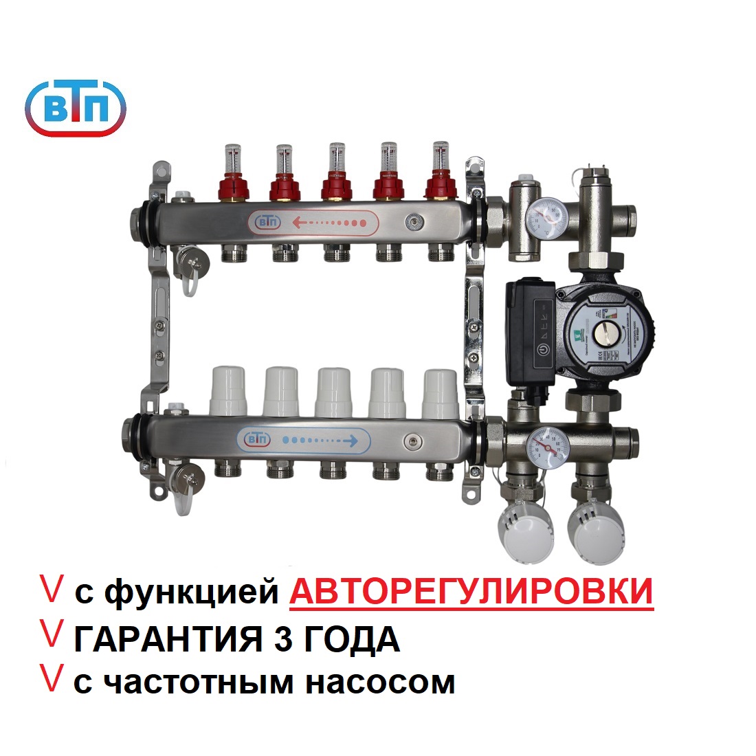 Полный коллекторный комплект -обвязка для водяного теплого пола ВТП КОМБО.Л 5 контуров с термоадаптивным насосно-смесительным узлом