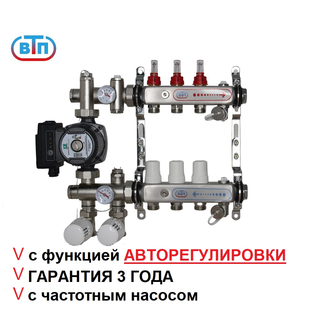 Полный коллекторный комплект -обвязка для водяного теплого пола ВТП КОМБО.П 3 контура с термоадаптивным насосно-смесительным узлом
