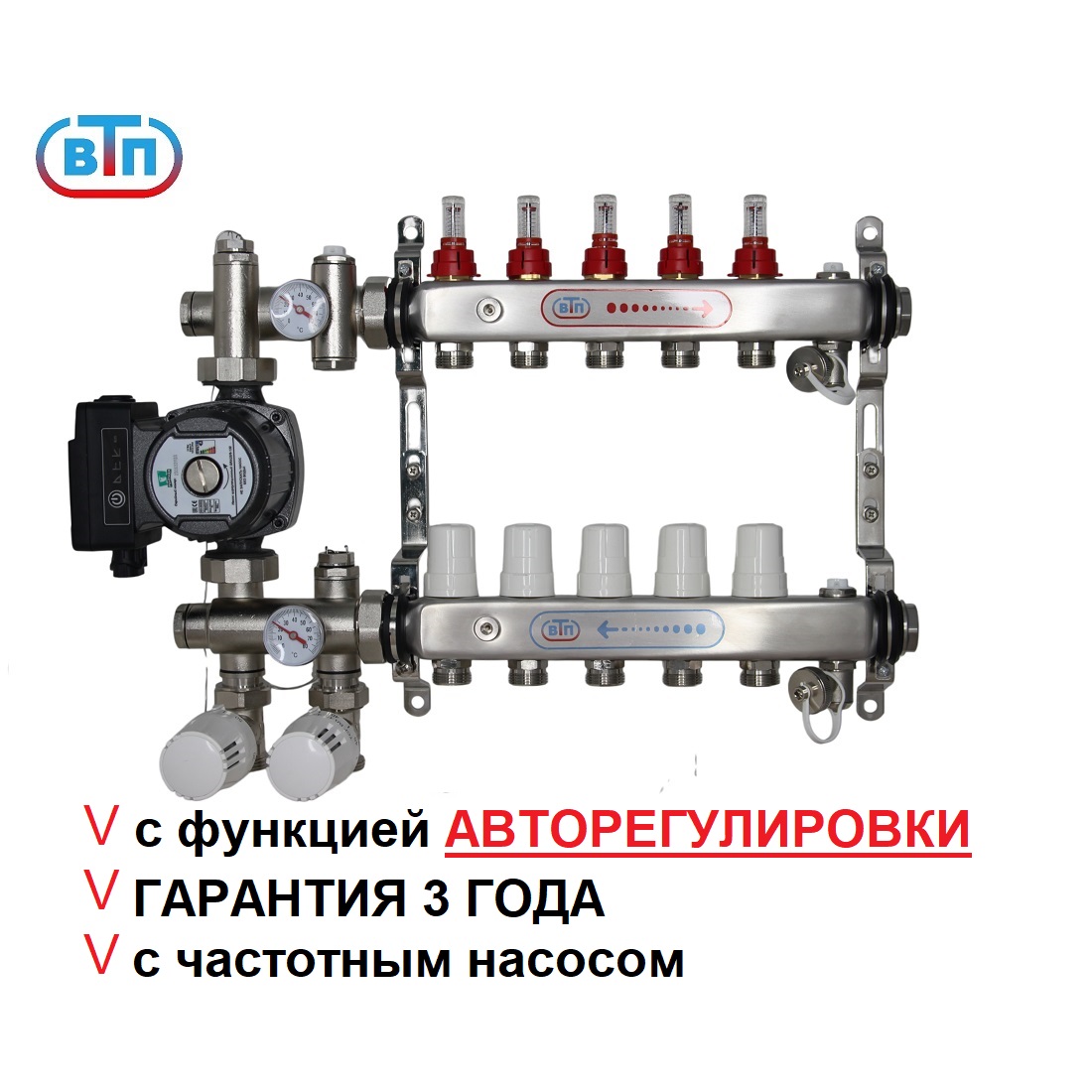 Полный коллекторный комплект -обвязка для водяного теплого пола ВТП КОМБО.П 5 контуров с термоадаптивным насосно-смесительным узлом