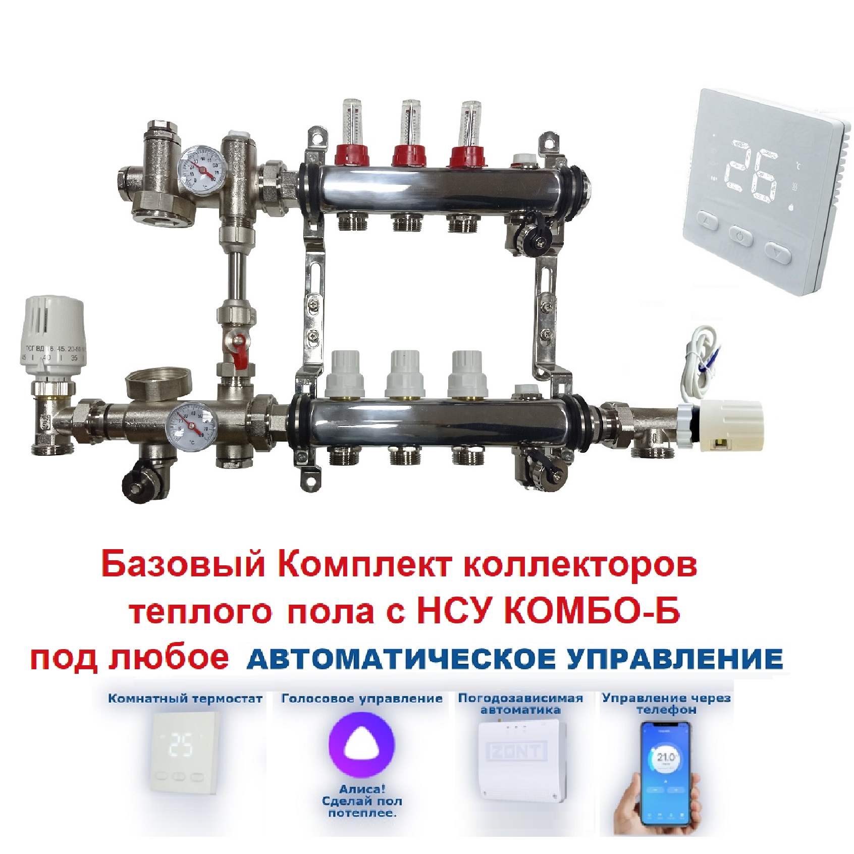 Базовый комплект коллекторов для теплого пола с НСУ КОМБО-Б, без насоса, KOMFORT представляет собой подобранный комплекс оборудования, предназначенный для циркуляции теплоносителя с пониженной, до настроечного значения, температурой. Его применение необходимо в тех местах, где температура теплоносителя в подающей линии может превышать рабочие параметры системы. Самым распространенным примером служит подключение системы водяных теплых полов и радиаторного отопления к одному котлу, в этом случае котел разогревается до температуры необходимой радиаторному отоплению(Tмакс.=95°С), а в теплые полы поступает теплоноситель с пониженной температурой(Tмакс.=55°С).